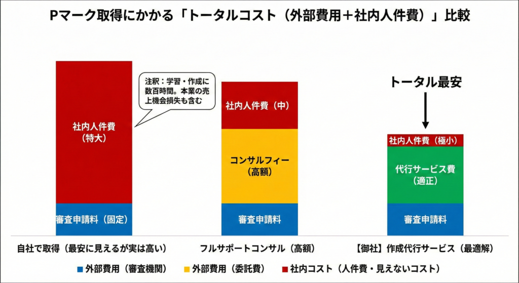Pマーク取得において、経営者が判断すべきは「外注費の安さ」ではなく、「社内リソースをどれだけ守れるか(投資対効果)」です。