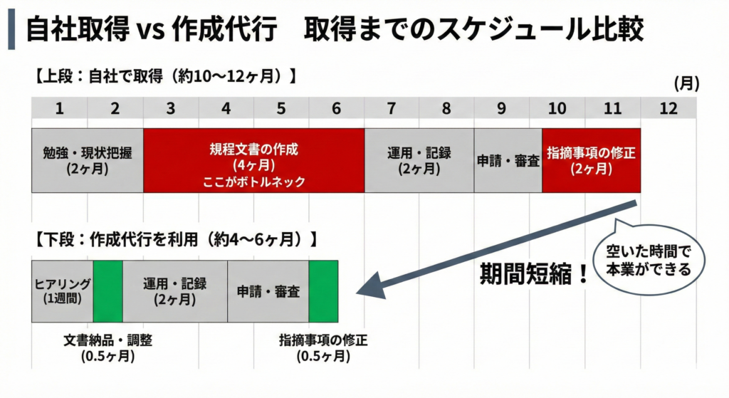 その結果、現地審査で大量の「指摘事項(不備の指摘)」を受け、その修正作業だけでさらに数ヶ月を費やすことになります。 「費用をケチった結果、優秀な社員のリソースを半年以上浪費し、トータルコストが高くつく」のが、最も避けるべき失敗パターンです。